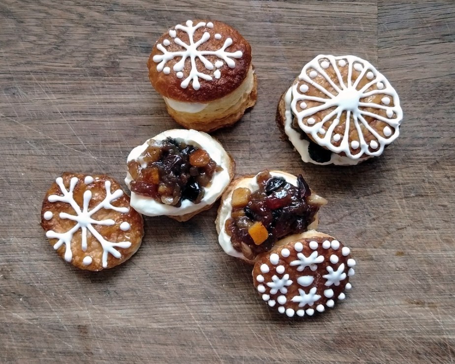 Mince pies are delicious, but they can be fiddly – especially if you have sausage fingers like me. Trying to get the pastry rolled thin enough, and neatly into the tins, is a challenge. Then too, with a very rich filling, a little variation in cooking times and they can either be a little greasy, or overcooked and dry, and an overall disappointment. With Mr Vine’s approach, everything is prepared separately, and then merely assembled when required. This allows for everything – mincemeat, cream, pastry – to be at it’s absolute best and remove much Faff™ and stress.