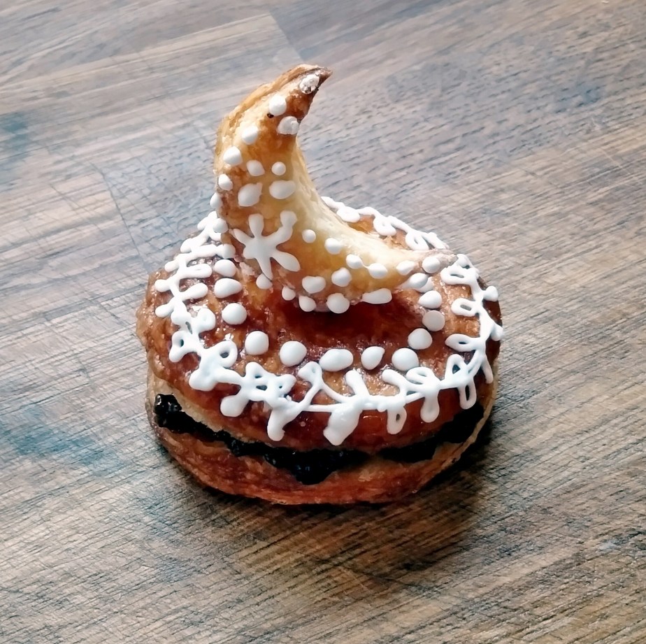 The pastry is baked by itself: rolled slightly thicker than usual – although ready-rolled is fine – the pastry is glazed and baked in whatever shape you like. Once cooled, you can decorate with royal icing (optional), split them open and add your filling.