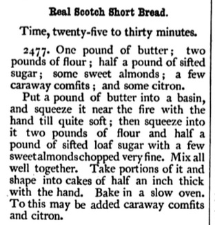 Behold this recipe from Mary Jewry, editor of Warne’s Model Cookery and Housekeeping Book (1868). The first thing that caught my eye, and got me thinking, was the proportions of the ingredients. Nowadays, a proportion of 1:2:3 (of sugar, butter and flour) is touted by many as traditional, but here was a proportion of 1:2:4. Also of interest was the addition of ground almonds to add texture, whereas modern purist recipes staunchly abide by the ‘rule of three’ (i.e. no additions, especially not caraway comfits and citron). Lastly, there was the cooking temperature – a slow oven – which is different to the short sharp bake at high temperature in use today.
