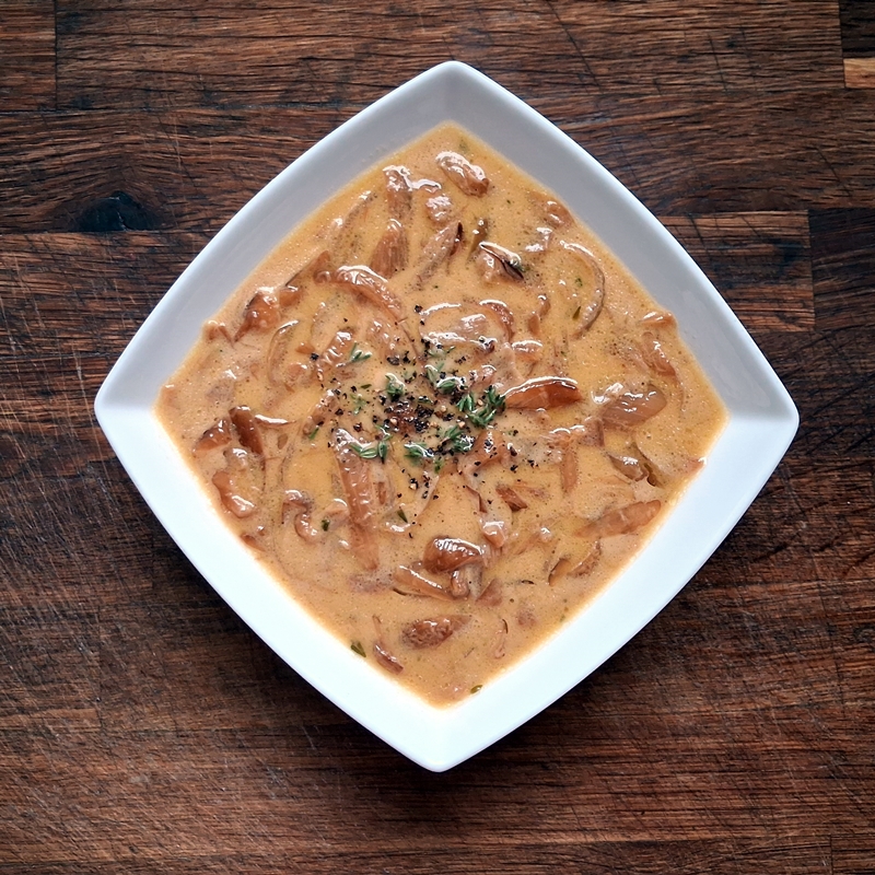 I love the addition of the fresh herbs in the cooking liquid, adding a real savoury note to the soup. This recipe also suggests ways in which the soup can be enriched, either by the addition of milk or broth for the cooking liquid, but only either one or the other, never both together. Adding milk to hot liquids can be tricky, because it is prone to curdling if you take your eye off the pan for a second and the soup gets too hot. One solution would be to use double cream, as the additional fat content helps to prevent curdling, but this might prove too rich for some palates. I recommend using a small can of evaporated milk: its caramel notes being very complimentary to the browned onions, and also much less likely to curdle.