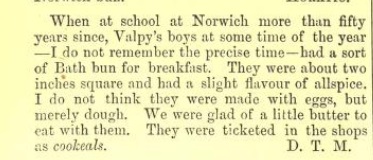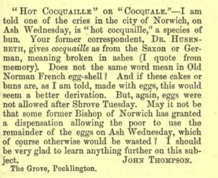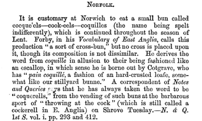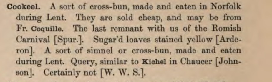 Cookeel: A sort of cross-bun, made and eaten in Norfolk during Lent. They are sold cheap and may be from Fr. Coquille.