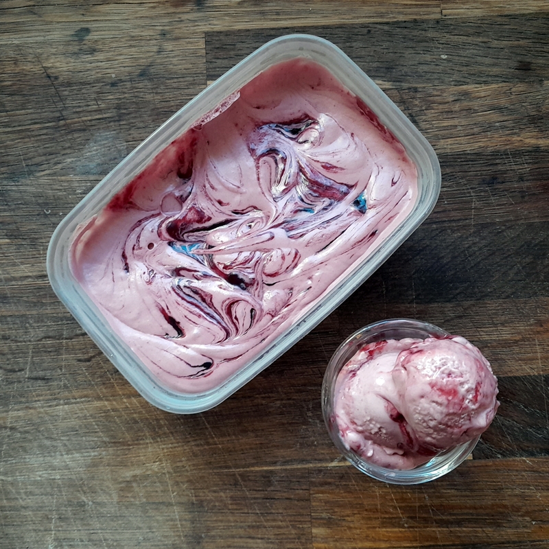 And so to this recipe. This is a fabulously simple recipe which makes beautifully soft and creamy ice-cream with just two main ingredients, plus flavouring, without the need for an ice-cream maker. This last point is especially useful if, like me, you lack worktop space. There is no need to repeatedly remove it from the freezer and stir to remove ice crystals, because they never form. You can literally mix it in minutes and freeze overnight and enjoy perfectly smooth, delicious ice-cream immediately.