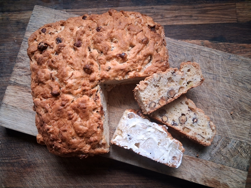 Apples and nuts were central to the feasting at Halloween and this sweet soda cake is rich with both kinds of autumnal bounty. Enjoy warm from the oven or toasted, with a generous spreading of good butter. I’ve chosen to use Bramley cooking apples, as they break down into fluff when cooked.