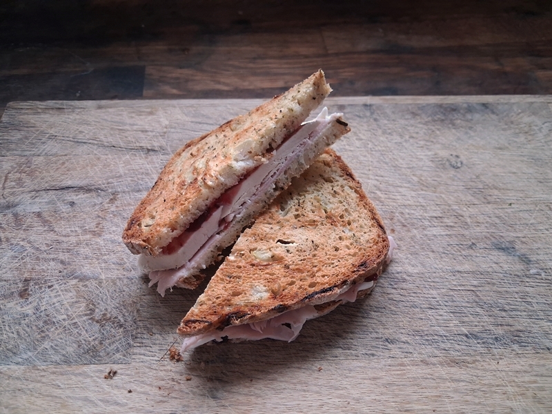 A toasted Stuffing Loaf sandwich with cold chicken, ham and cranberry sauce